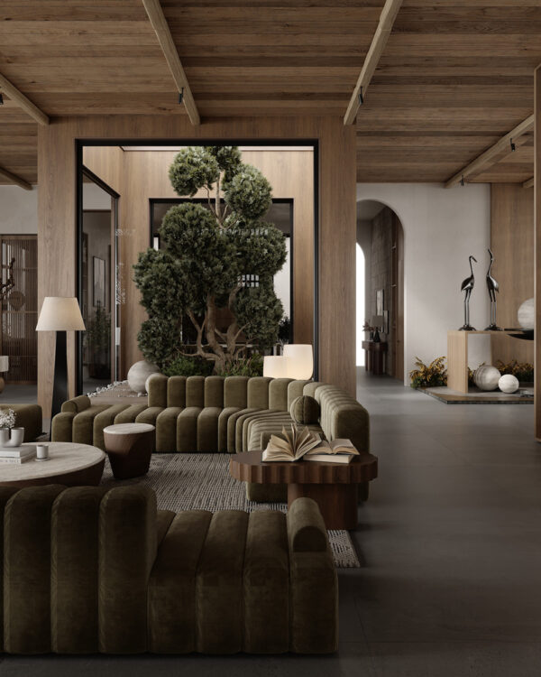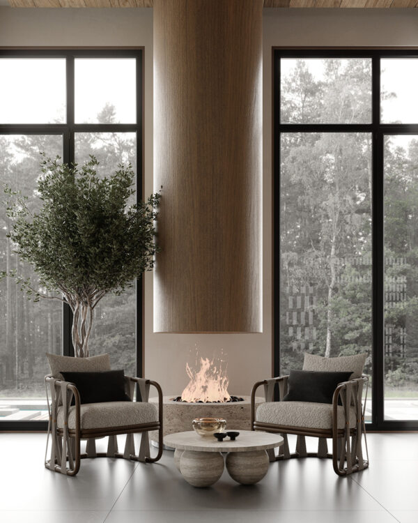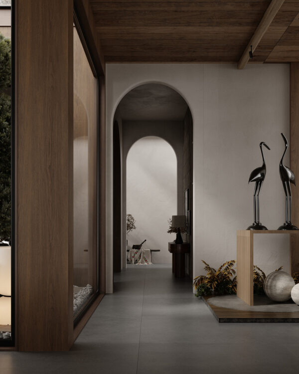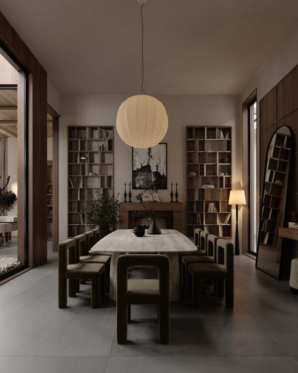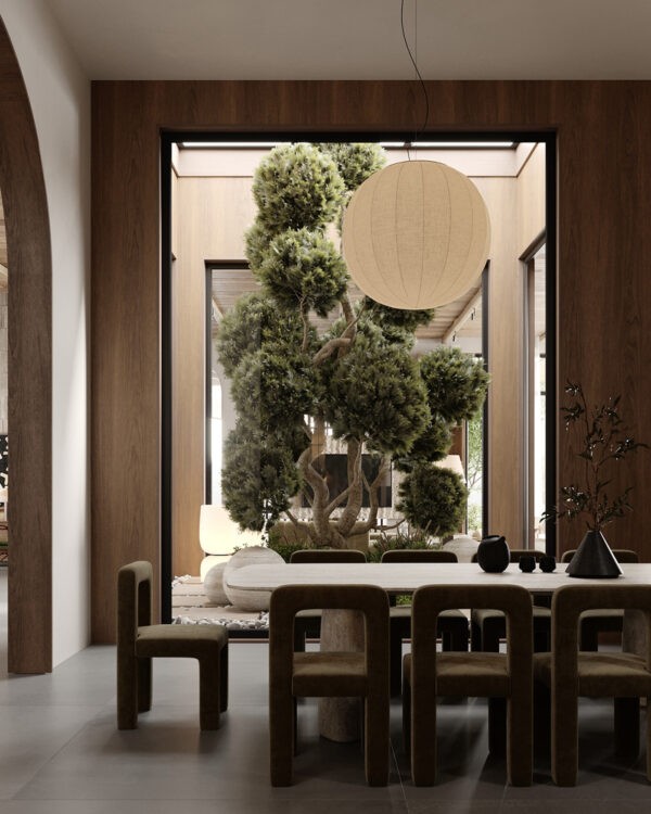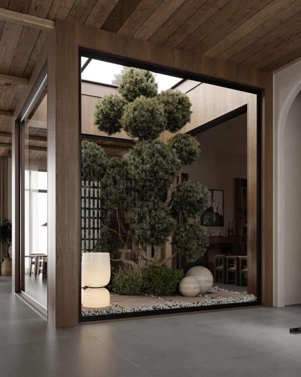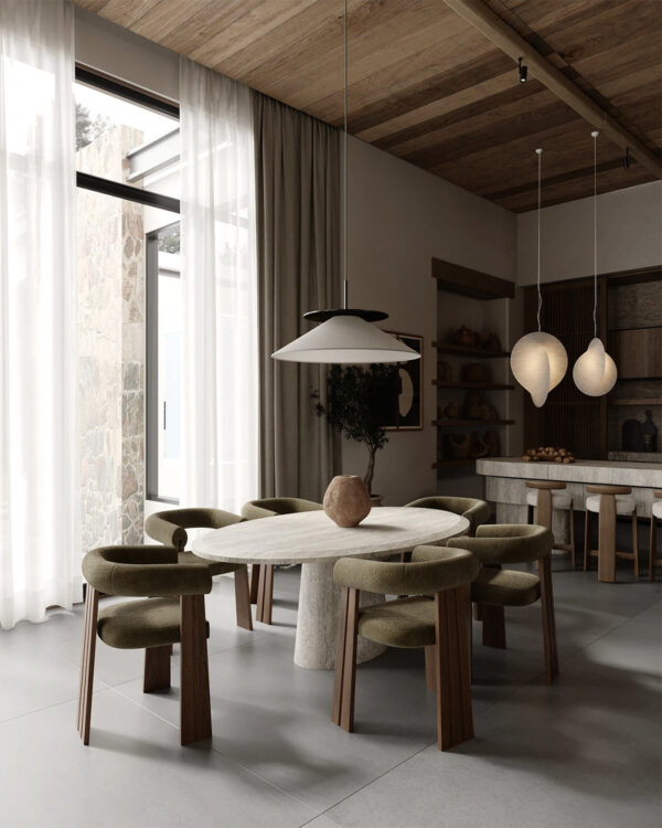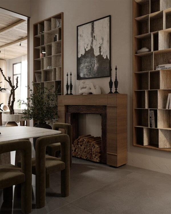 Embracing the essence of Earthy Modernism, this home visualized by Esraa Elemam is a testament to the new rustic aesthetic sweeping through contemporary design. With its rich, wooden textures that dance across ceilings and floors, and the stone accents that provide an anchor of natural serenity, each room whispers a story of modern sophistication entwined with the raw beauty of the outdoors. Here, clean lines and minimalist furnishings are thoughtfully juxtaposed against the backdrop of nature’s own artistry. As you step into this space, you are enveloped by an atmosphere that is both grounding and uplifting — a true sanctuary for the soul that exemplifies the harmonious blend of rustic charm and modern elegance.