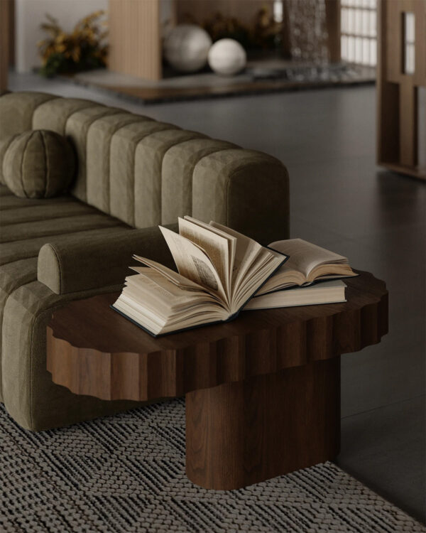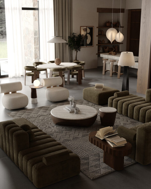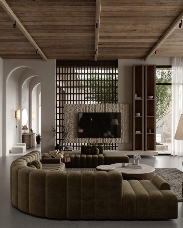 The living space marries plush, olive sectionals with rich wooden ceilings, creating a serene oasis that balances natural textures with the clean, sophisticated lines of contemporary design.